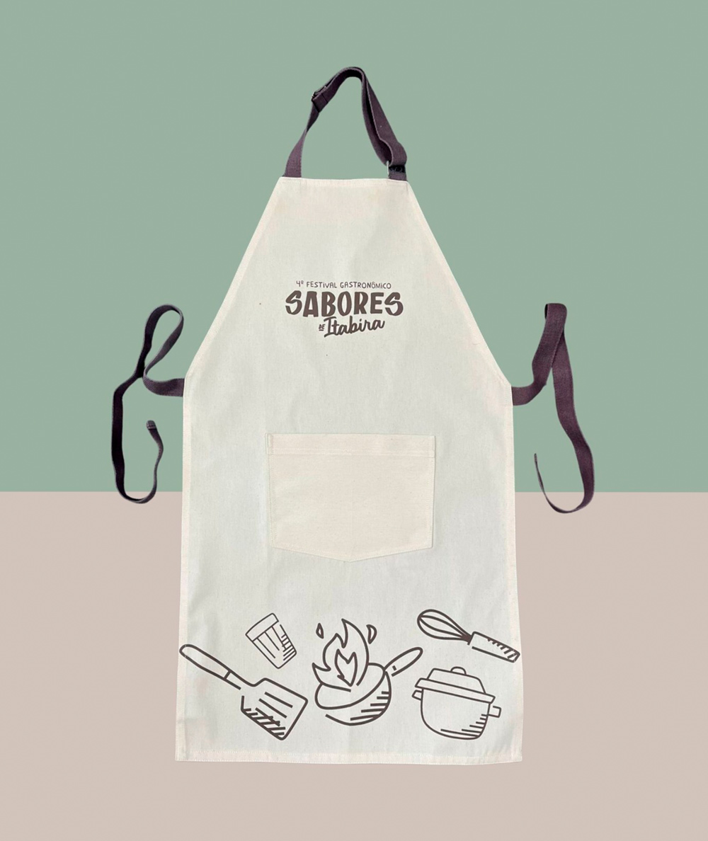 Cada peça recebe bordados feitos à mão com motivos da culinária mineira — um toque autoral que transforma o avental em item único, carregado de história e identidade.