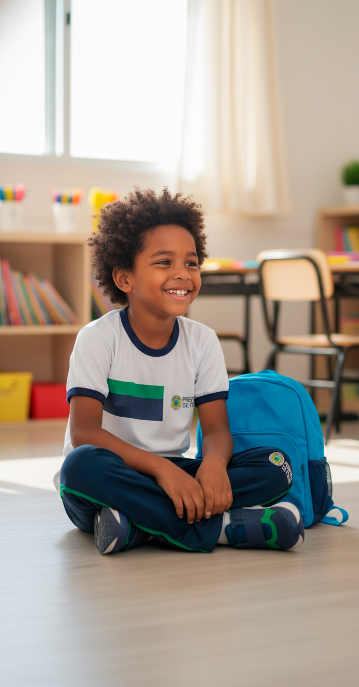 Modelagem pensada para permitir total liberdade de movimento, ideal para aulas, recreio e atividades esportivas leves.