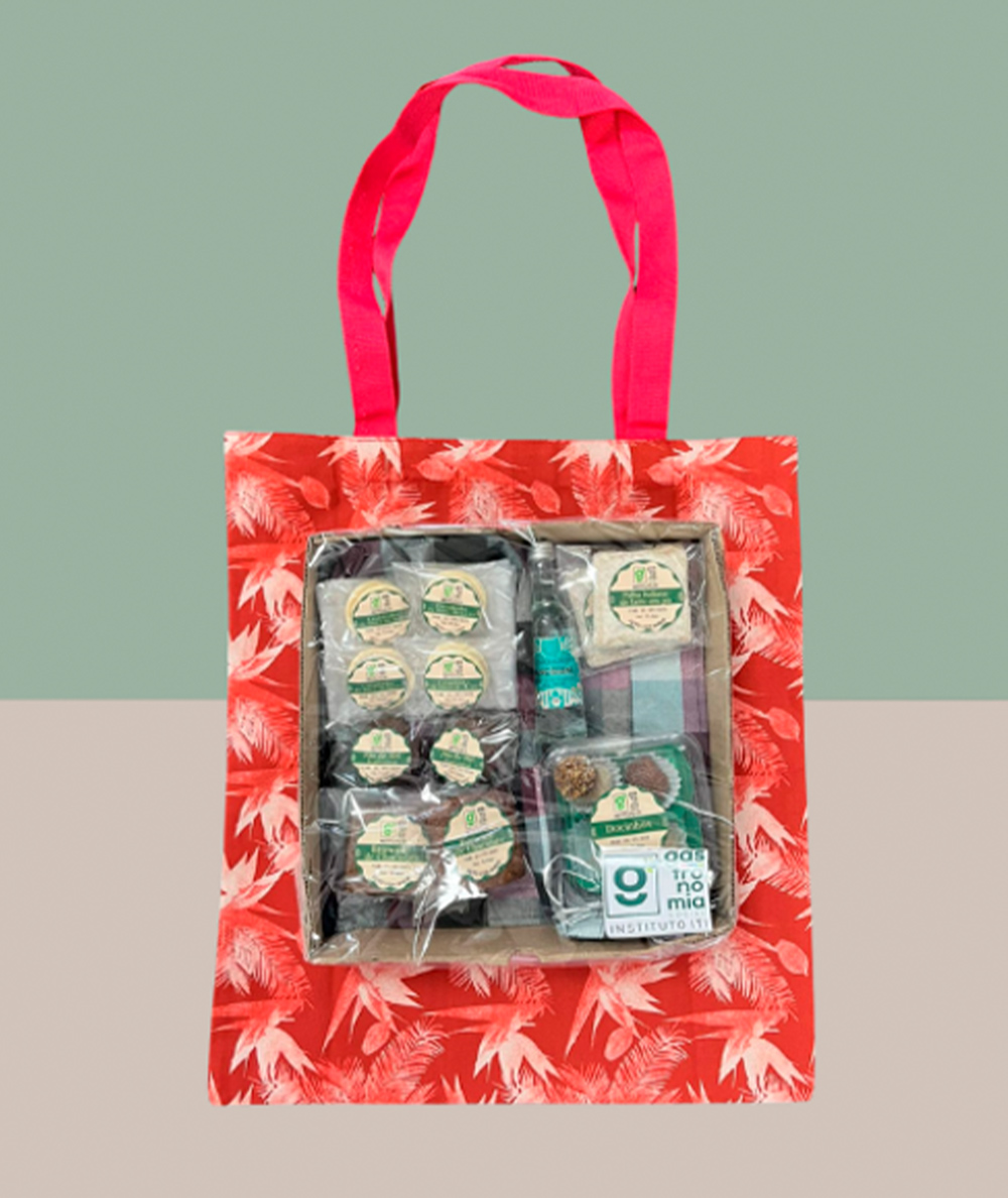 Palha Italiana (choc. ou leite em pó), Brownie, Pão de Mel c/ doce de leite, Casadinhos (doce de leite ou brigadeiro), Mini Cachaça, 4 brigadeiros, par de guardanapos, par de jogos americanos, caixa e ecobag.